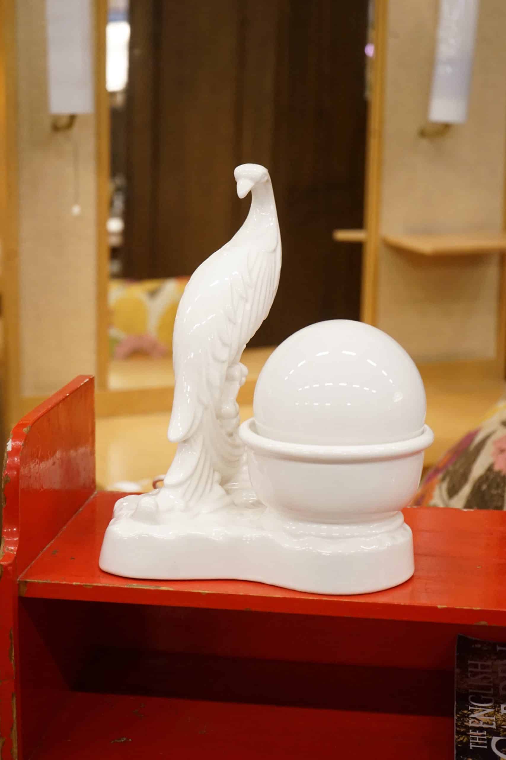 Vit glaserad keramik i form av fågel. Vit opalglas lampskärm.