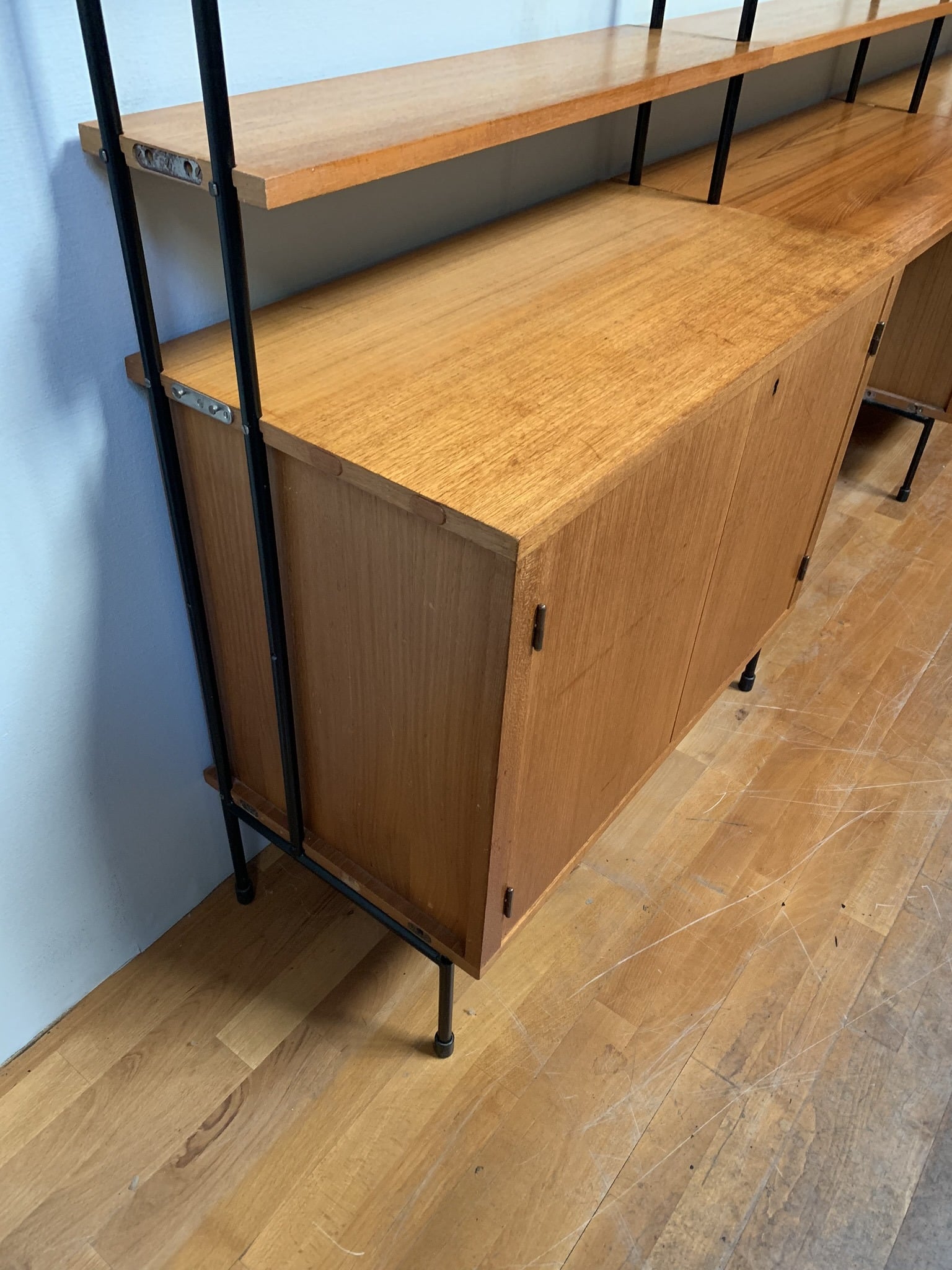Hyllsystem i teak med gavlar i svartlackerat stål.