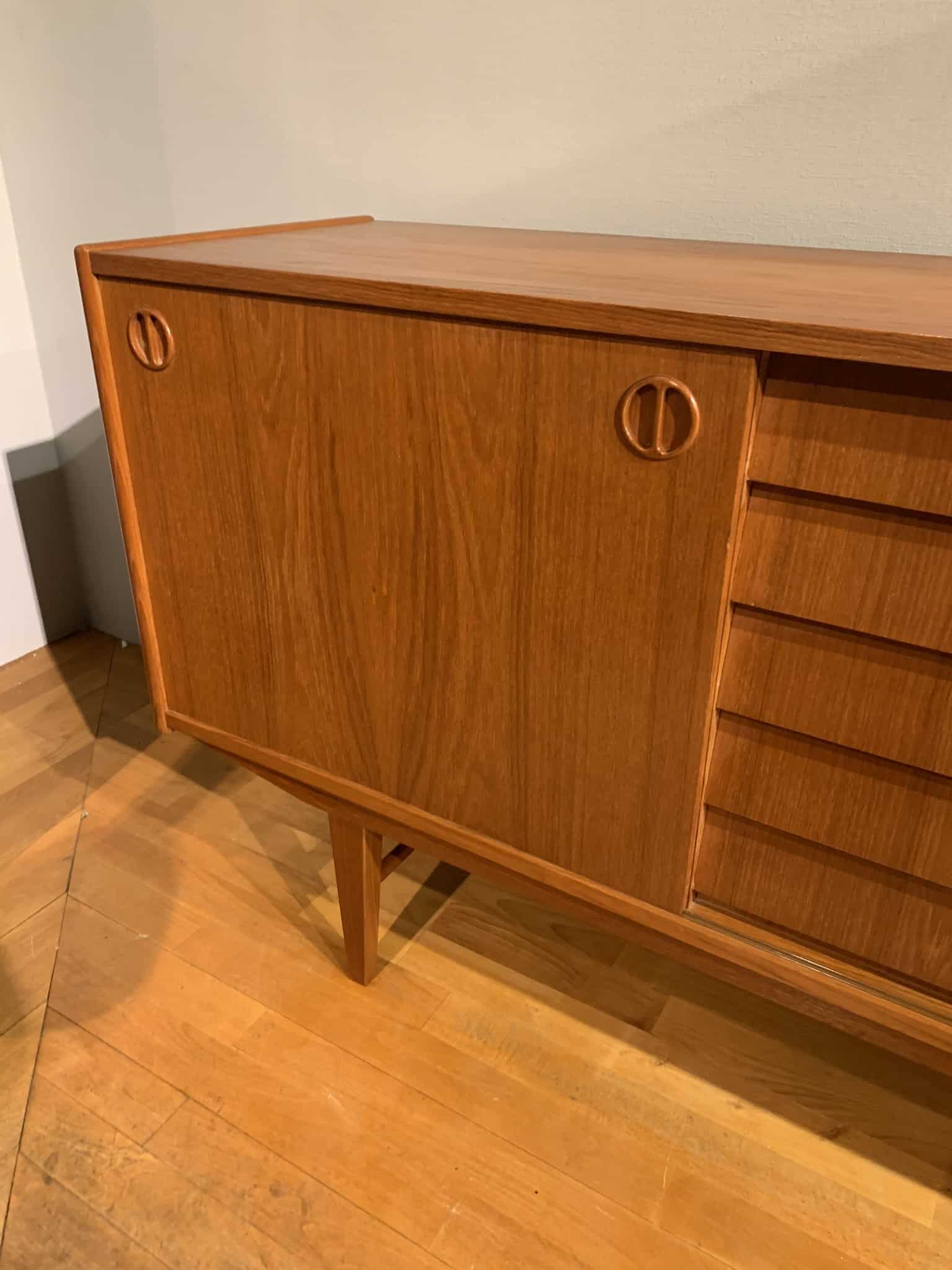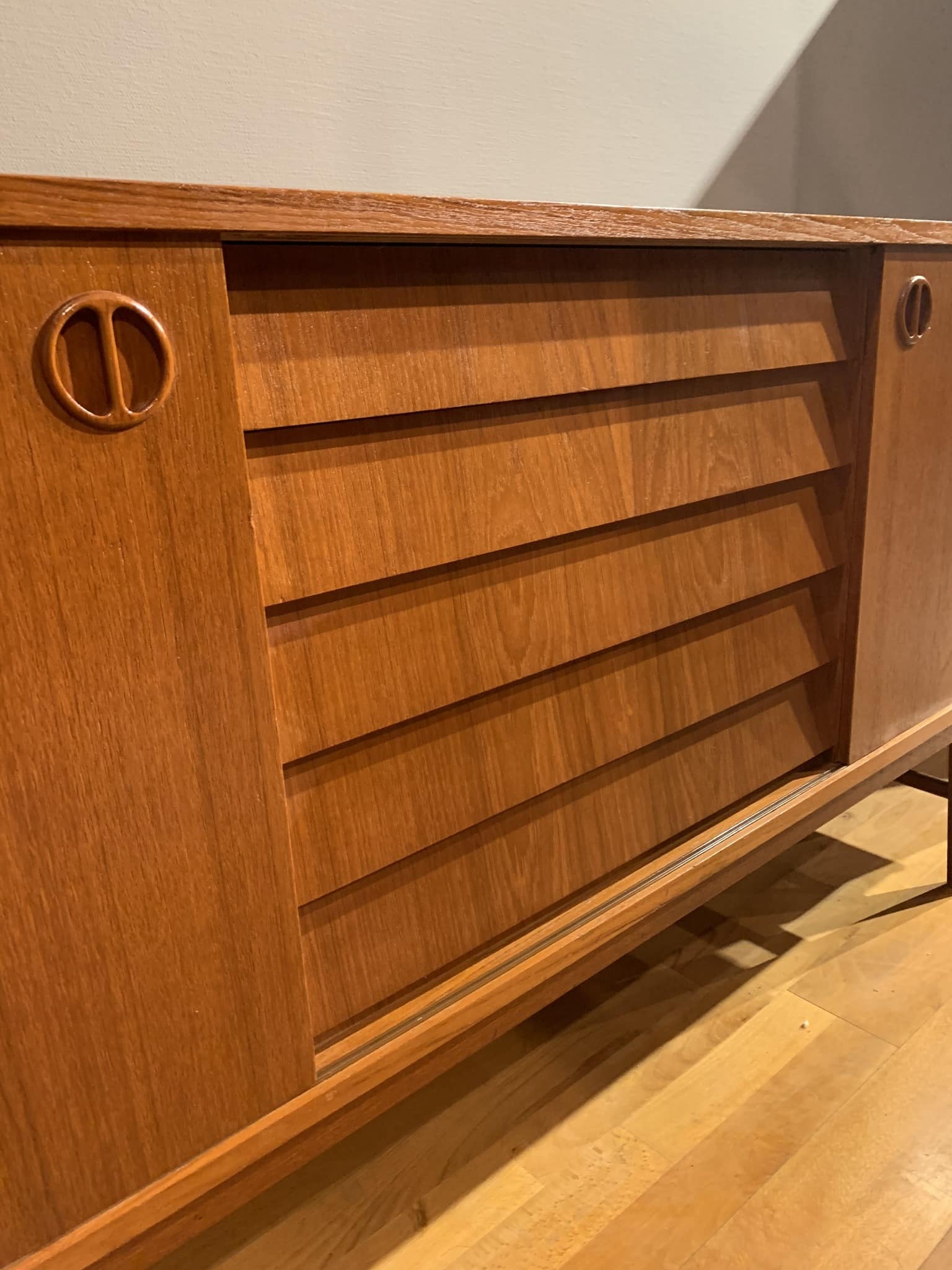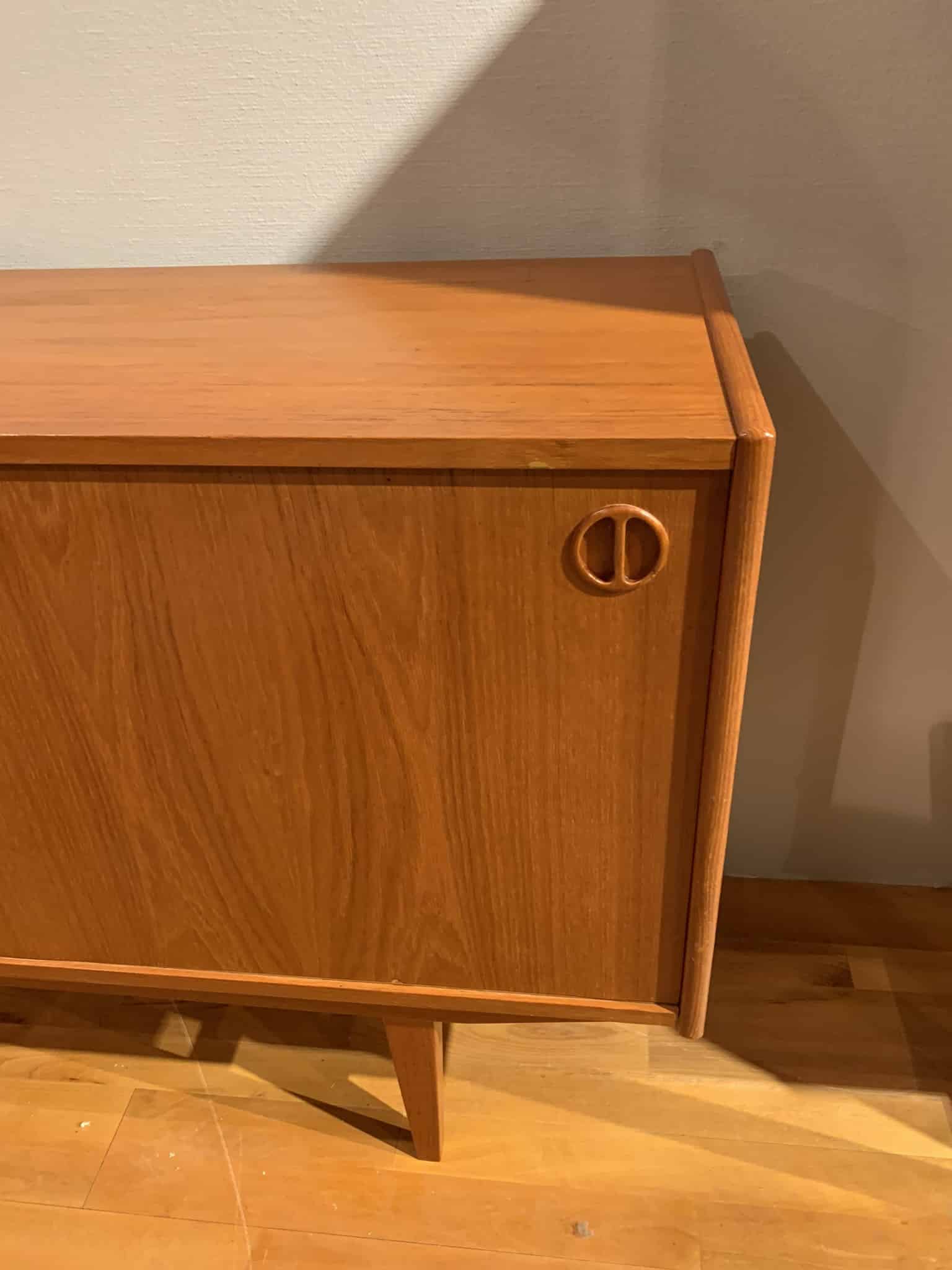 Hyllplan invändigt. Rundade handtag & snedställda lådor.