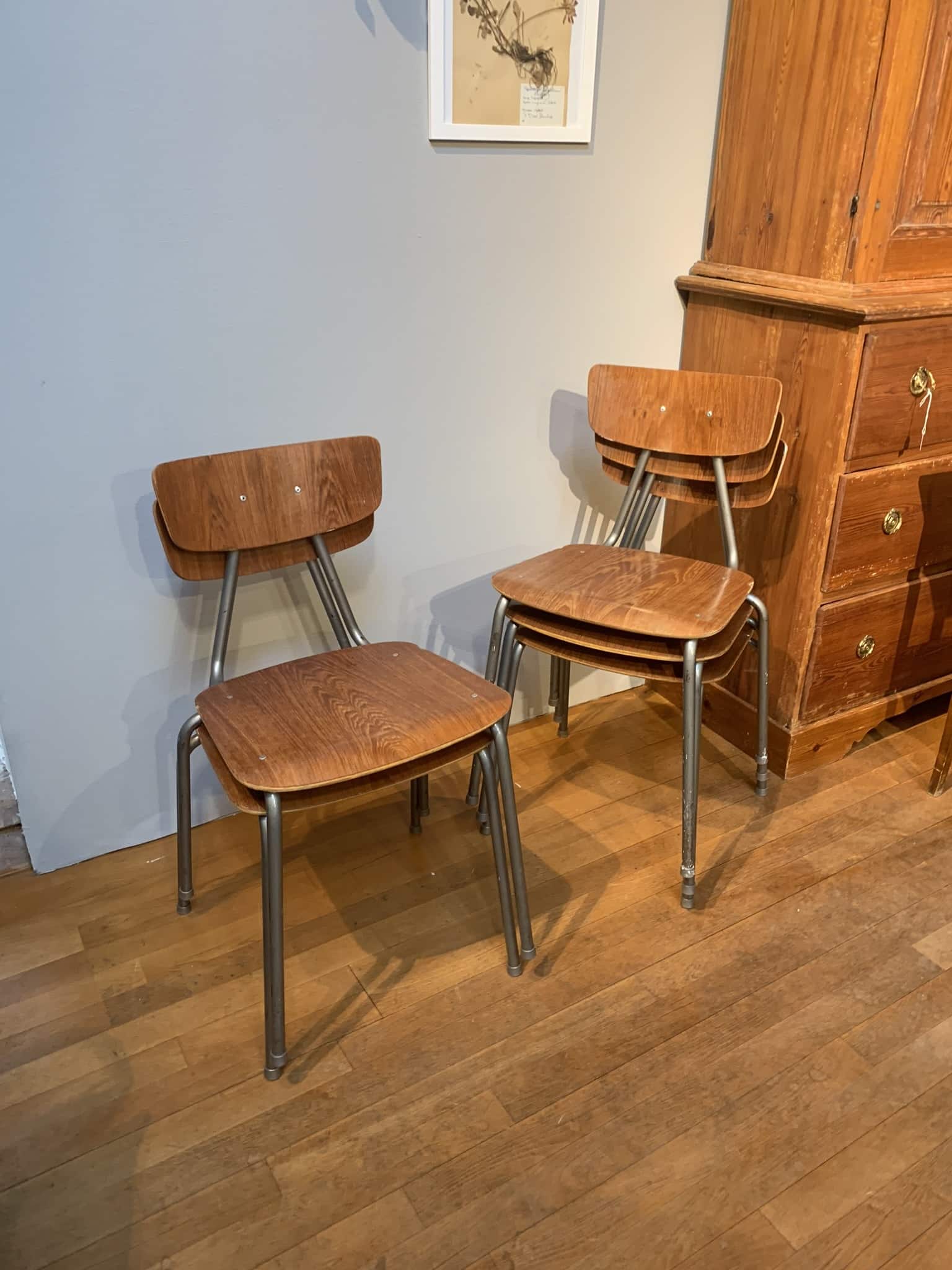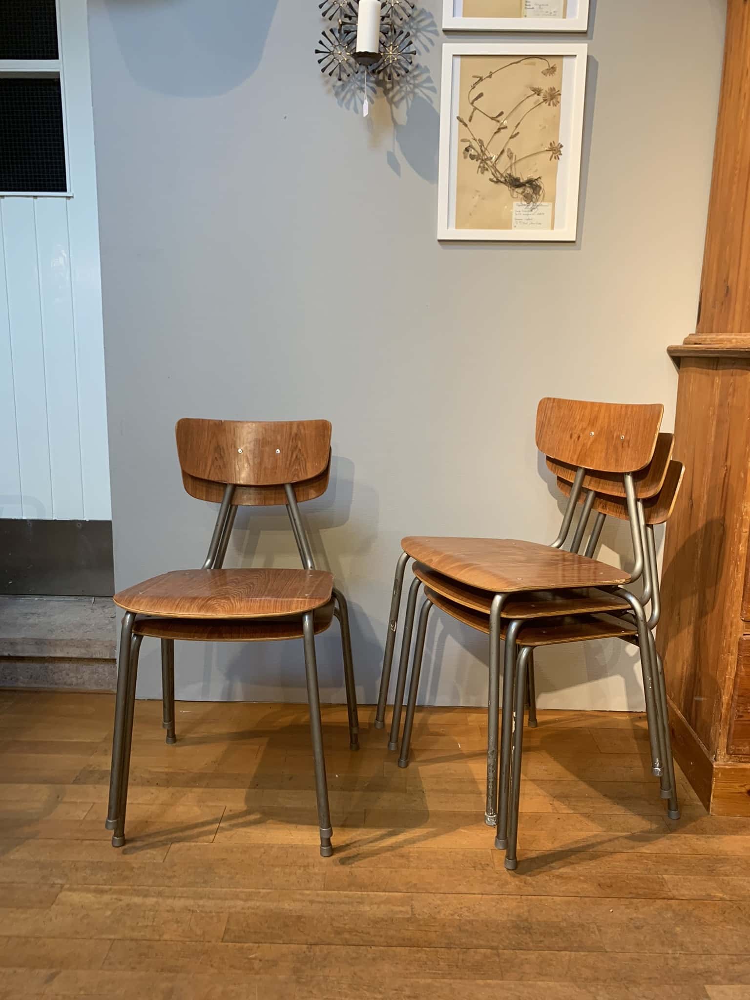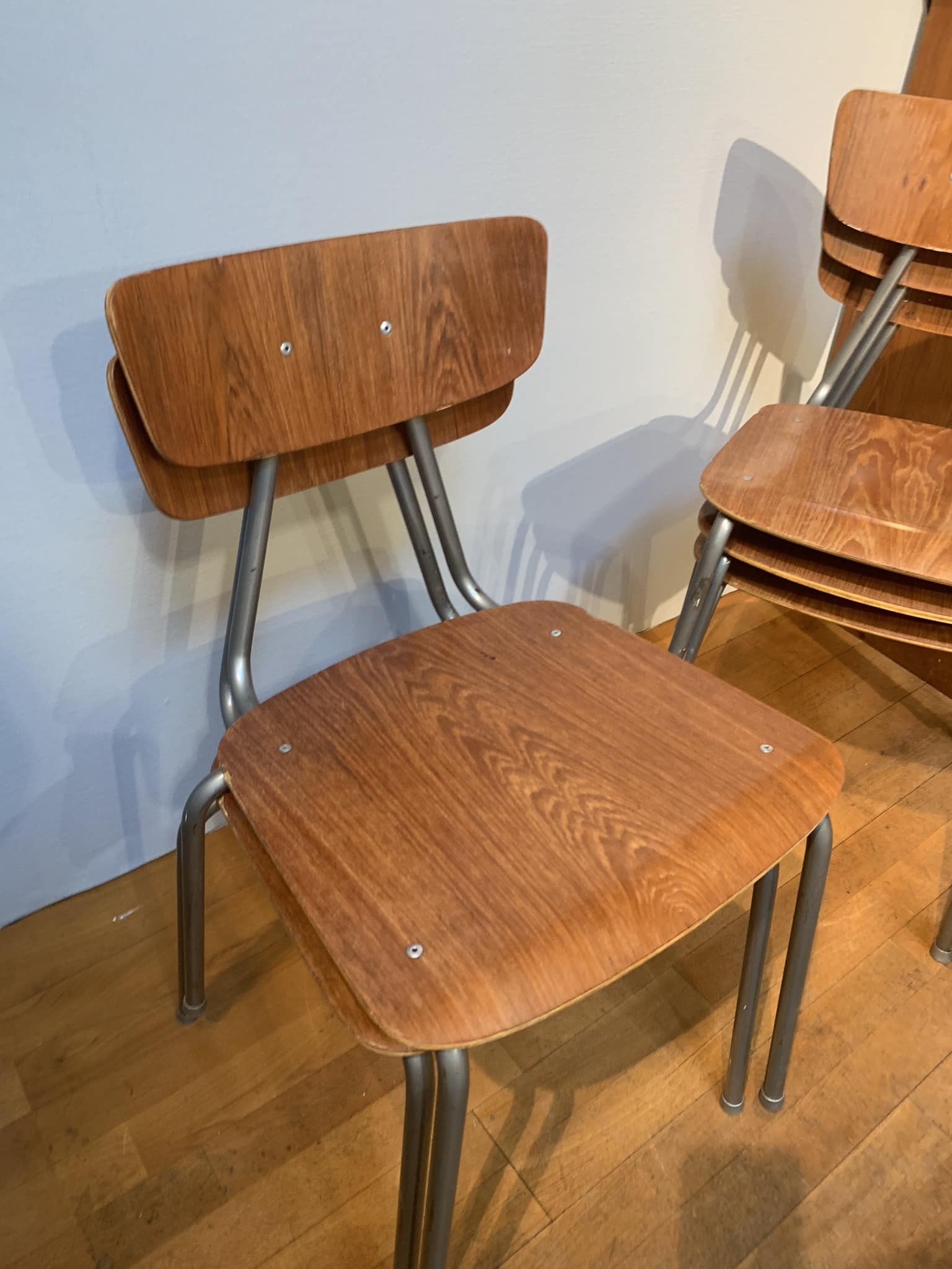 Skolstolar/ Industristolar, formpressad teak & stålrör, 1960-tal.