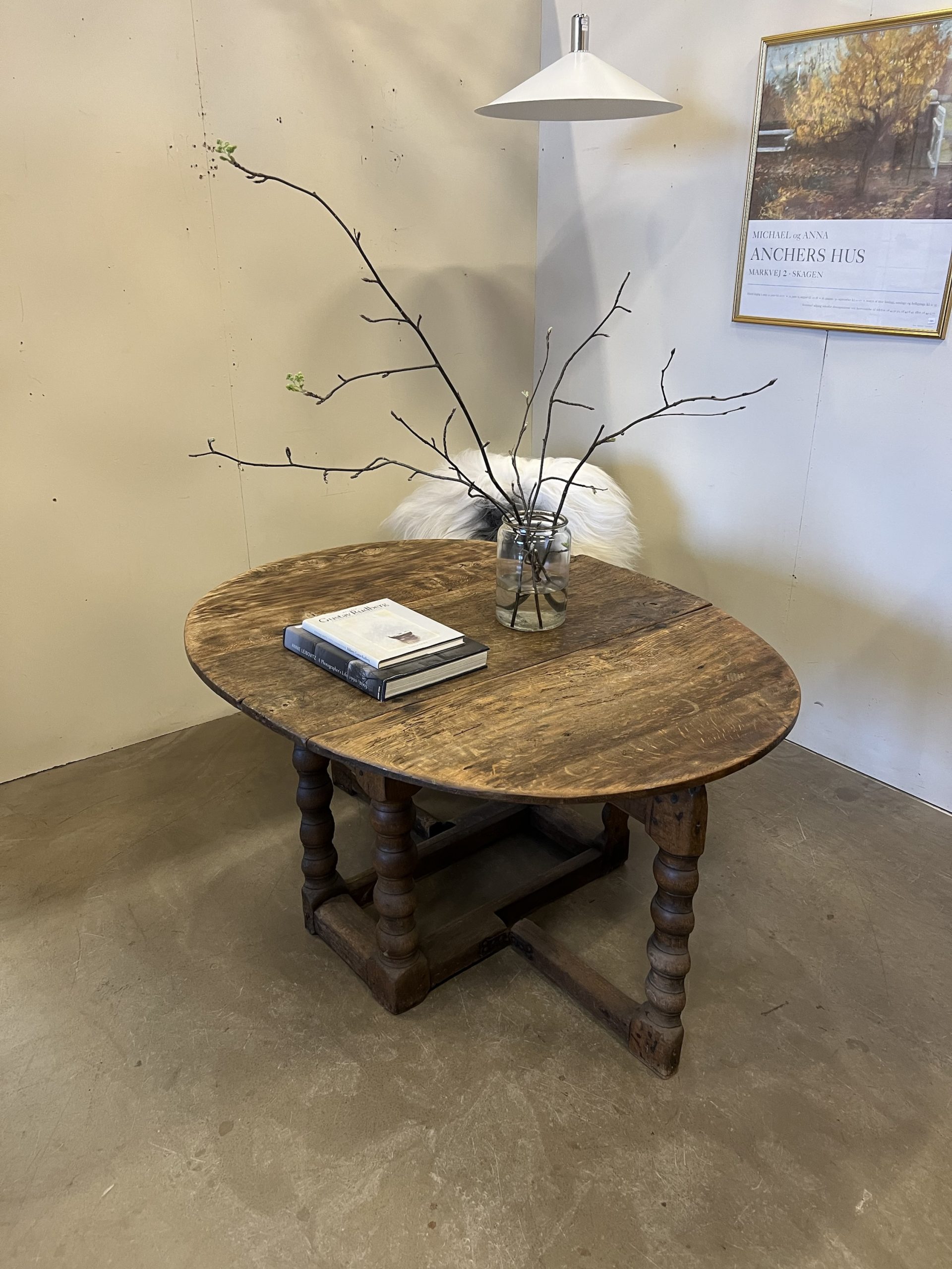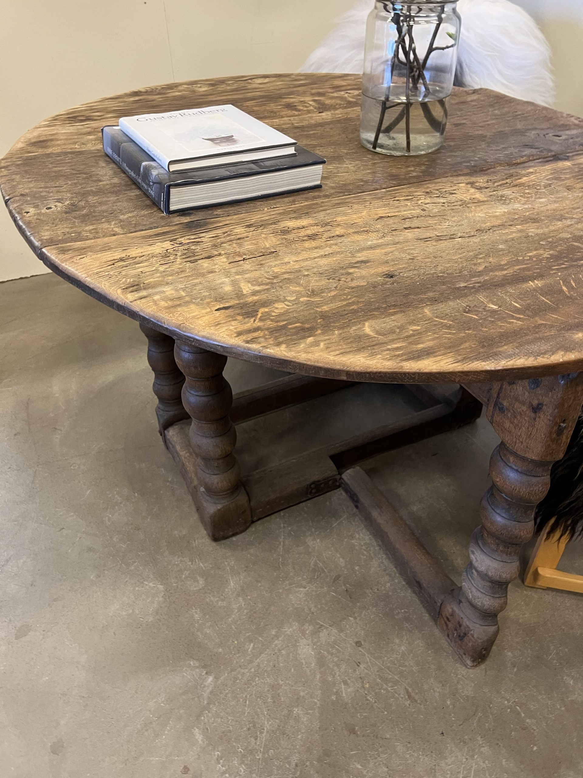 Ek, två fällbara rundade skivor, benställning med kopplade ben, två utfällbara grindar.
