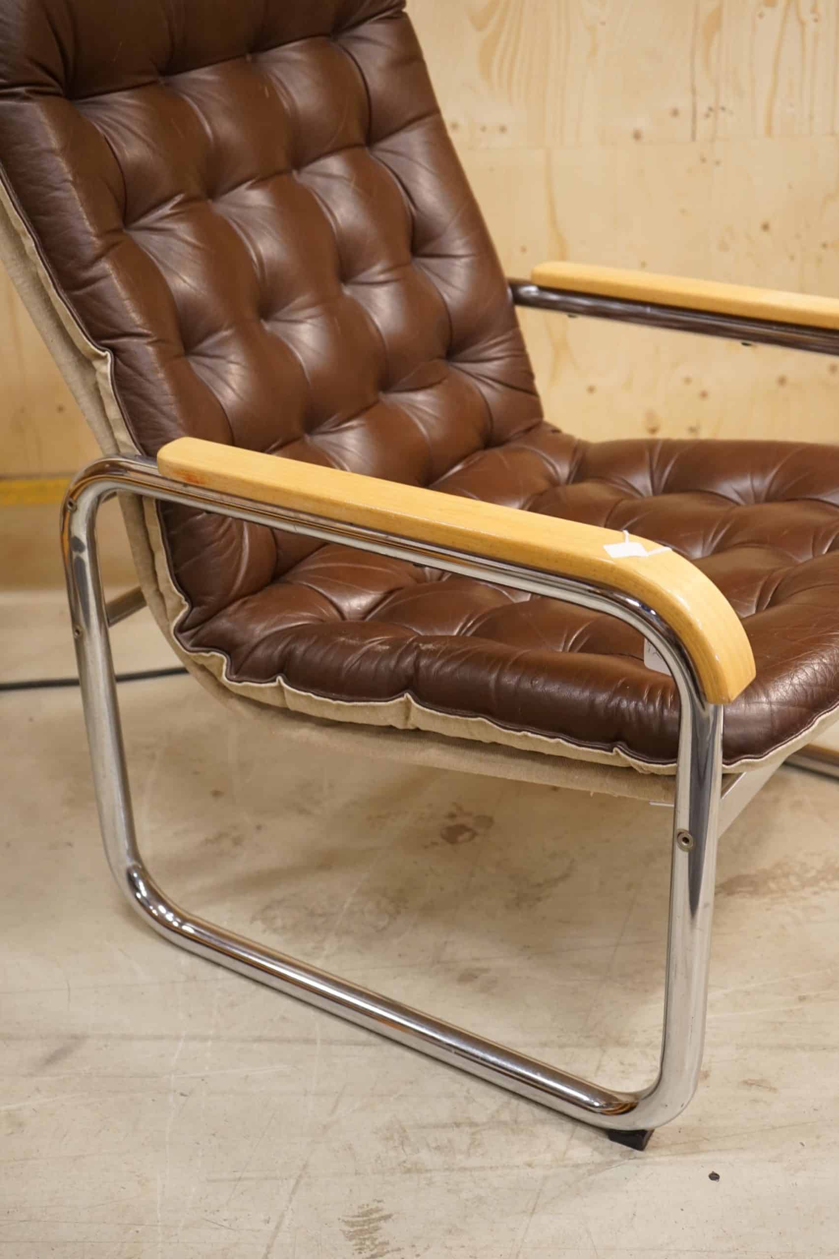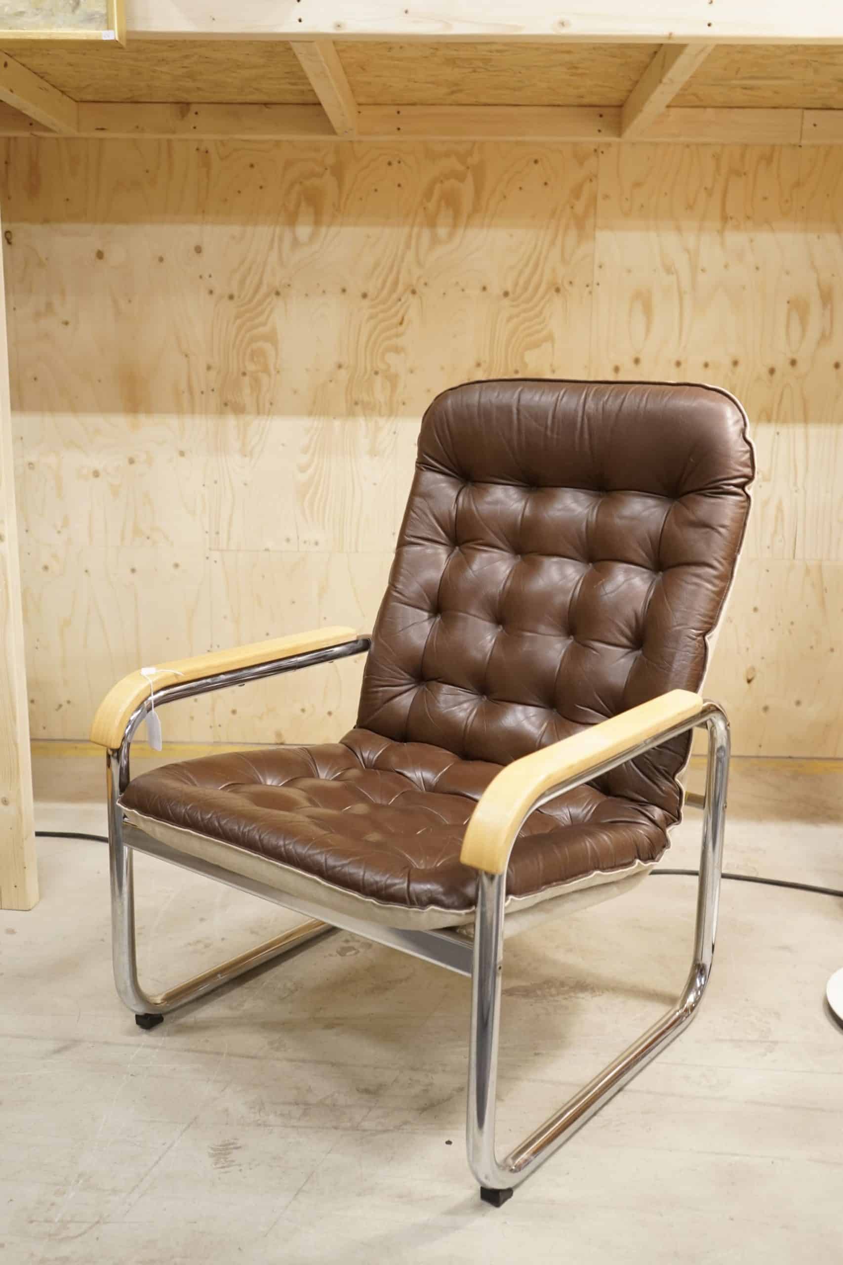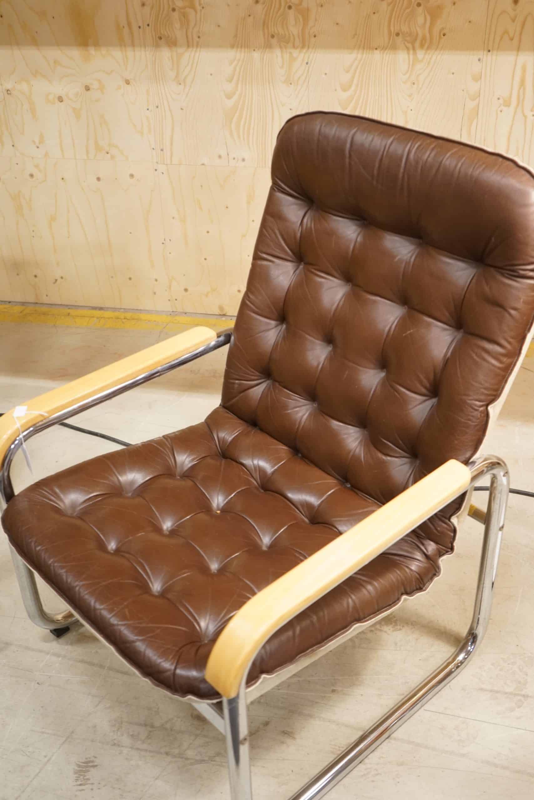 Stålrörsfåtölj i chokladbrunt läder, 1970-tal.