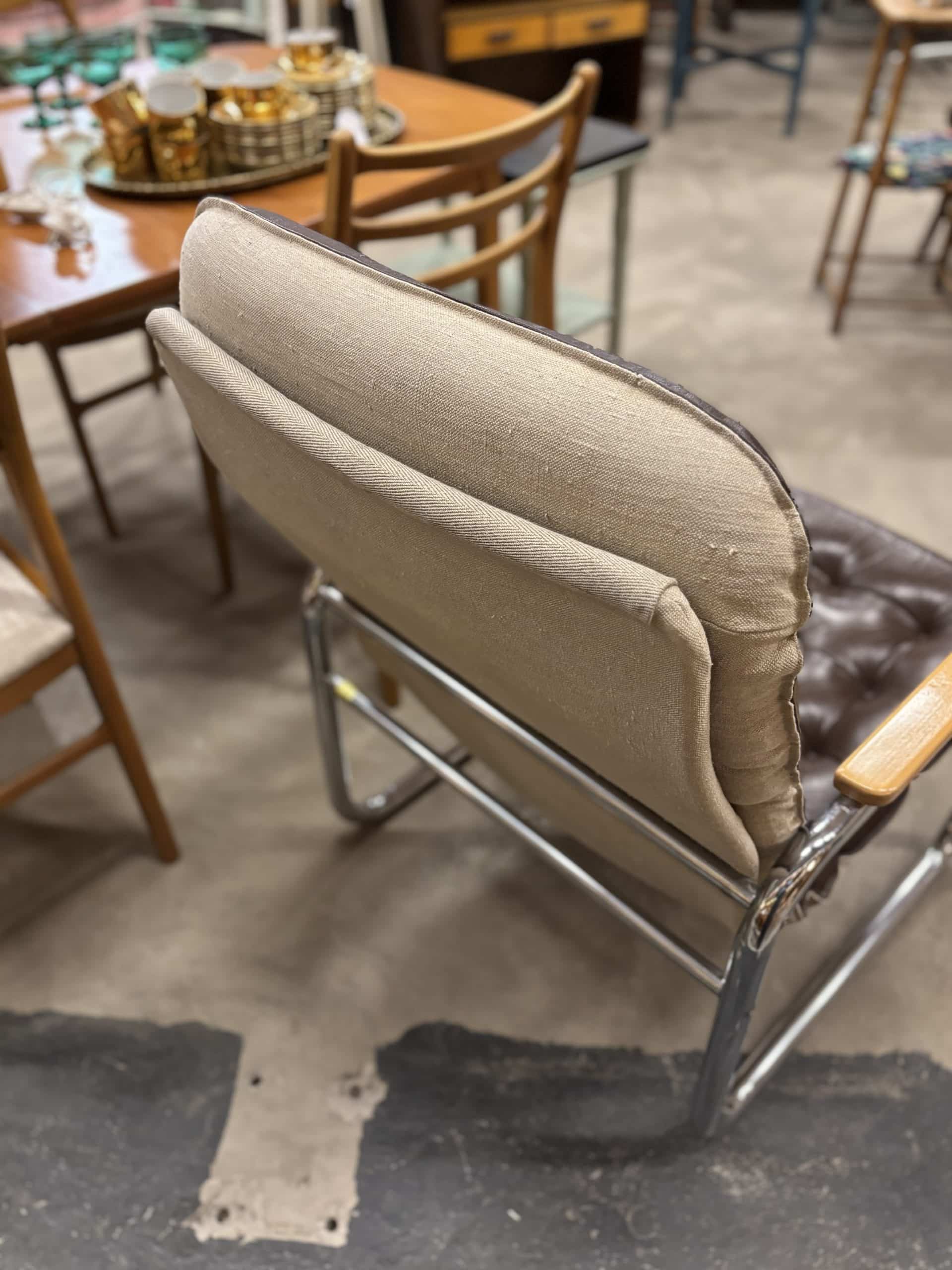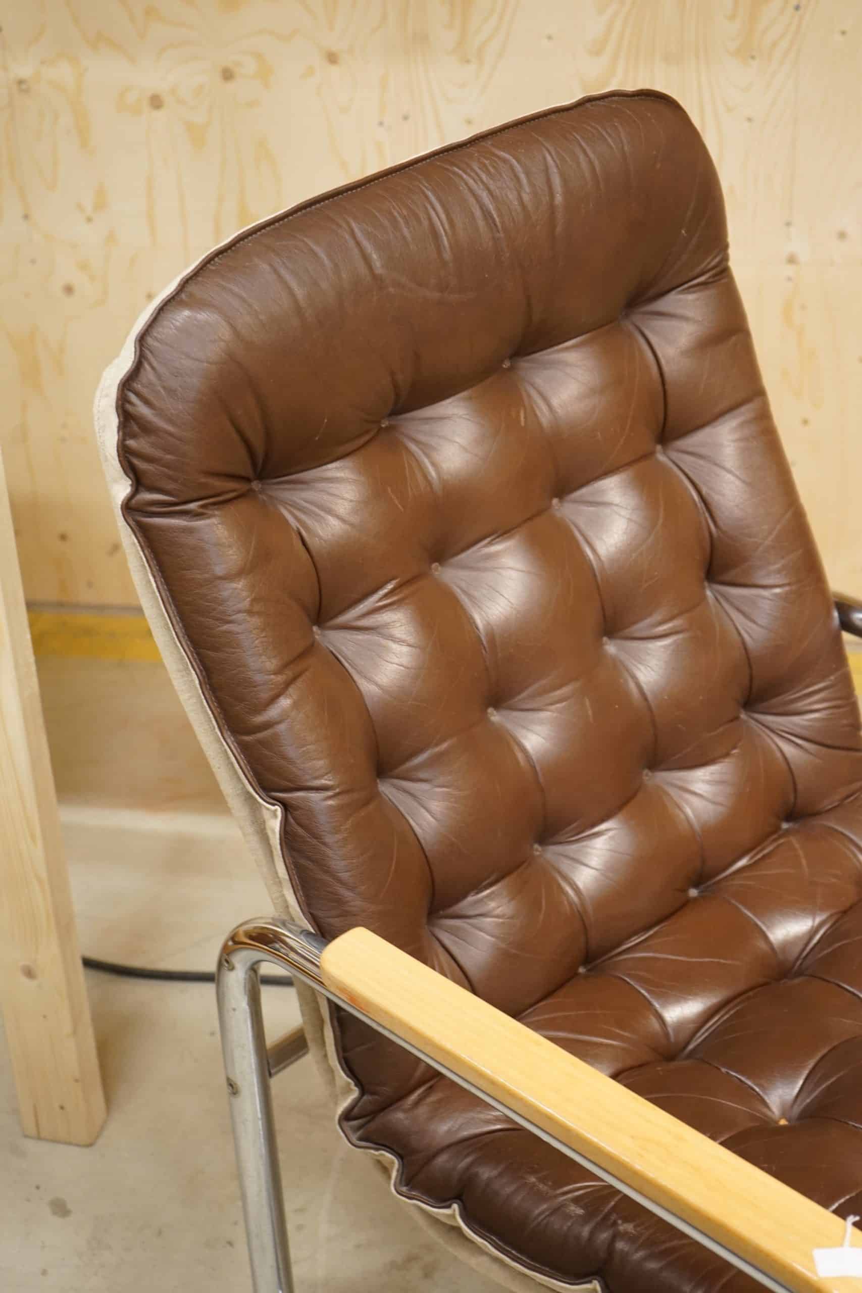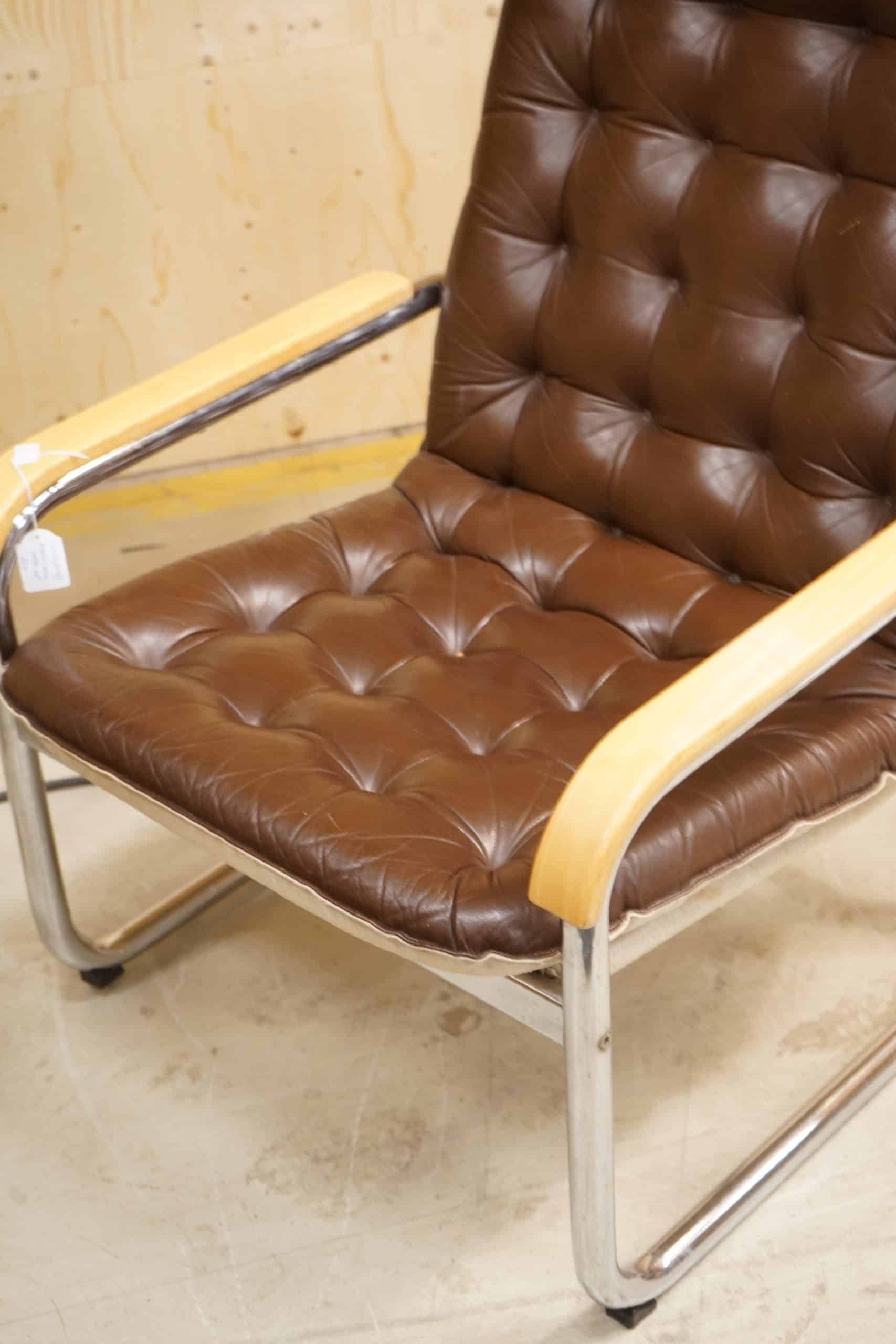Stålrörsfåtölj i chokladbrunt läder, 1970-tal.