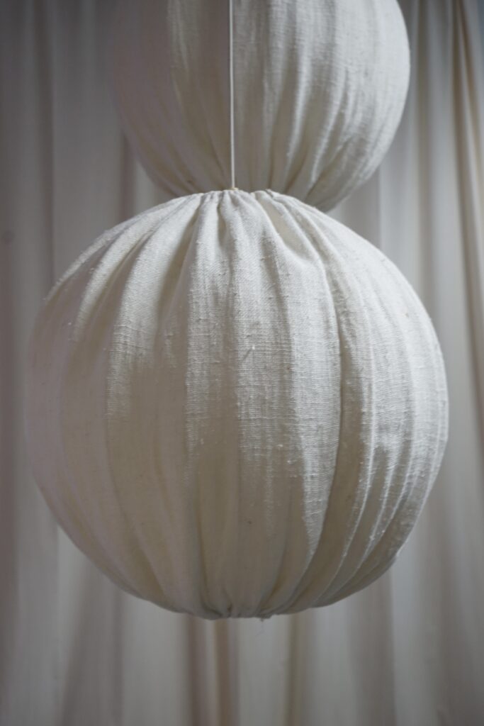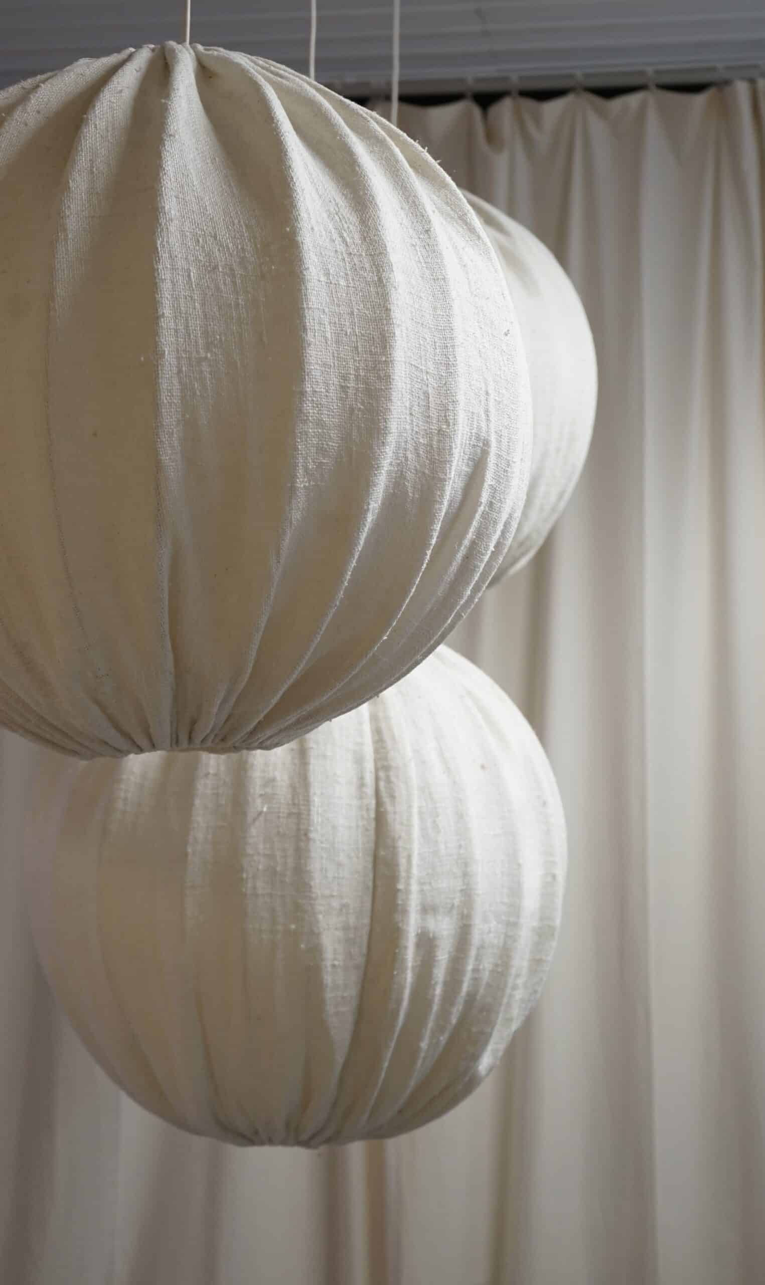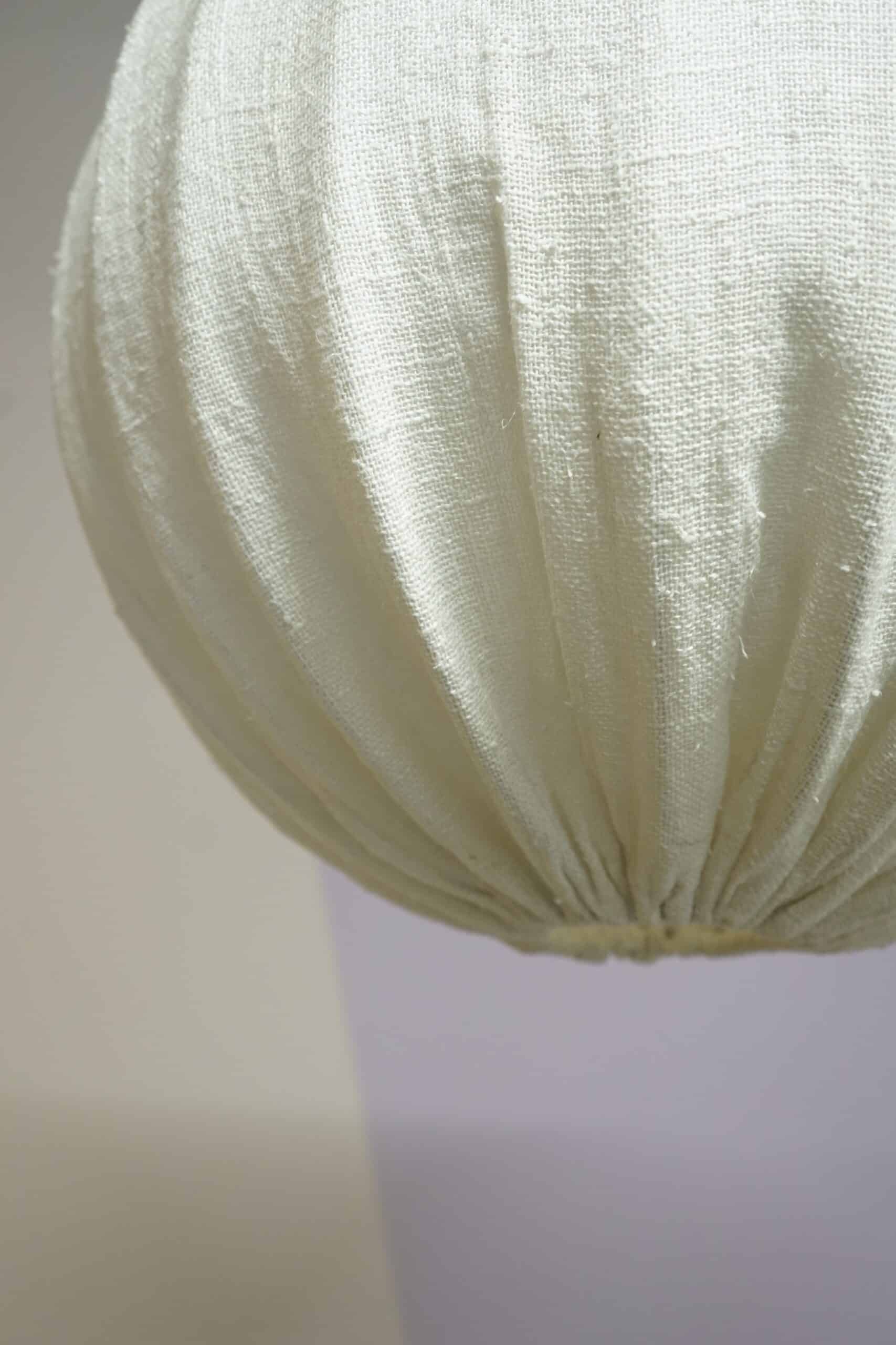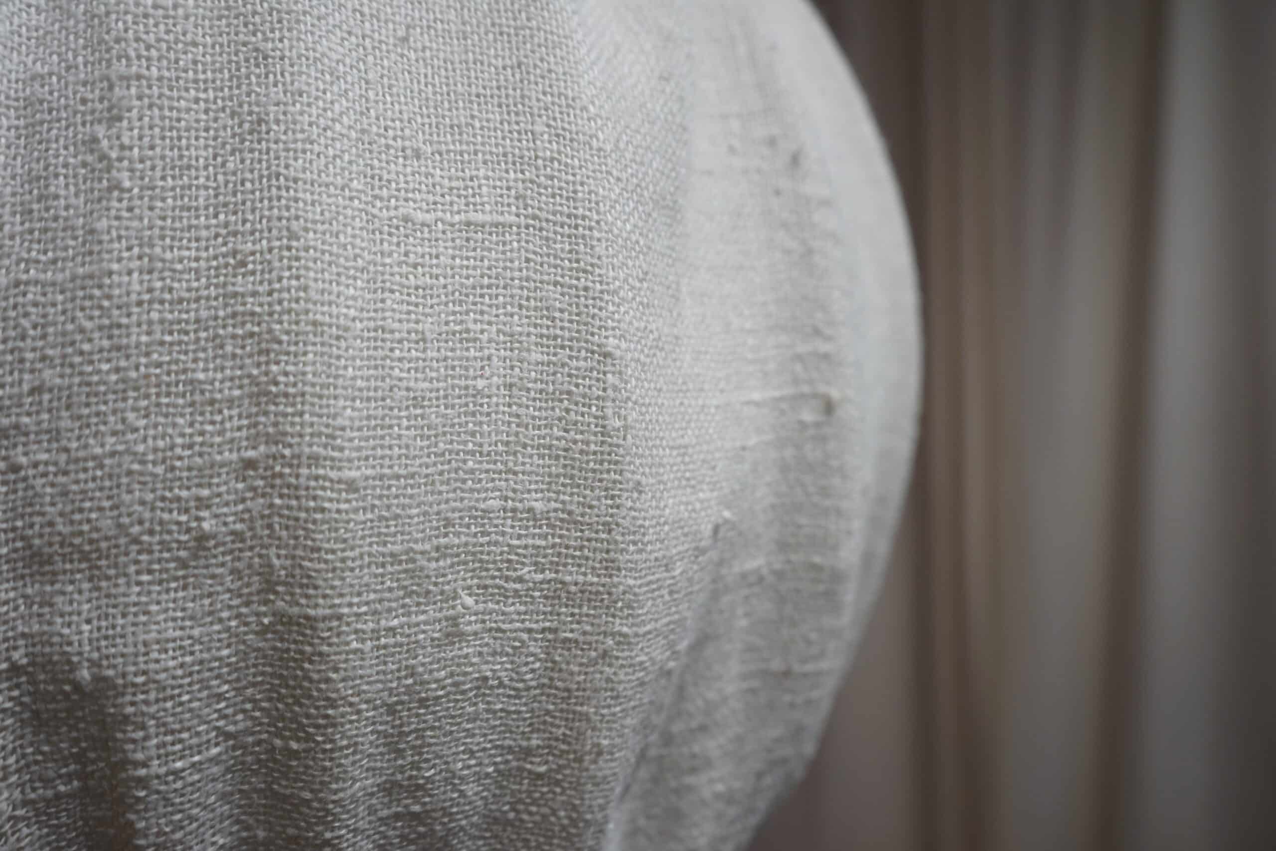 Bollformad, stålram, klädd i ett naturfärgat linnetyg.
